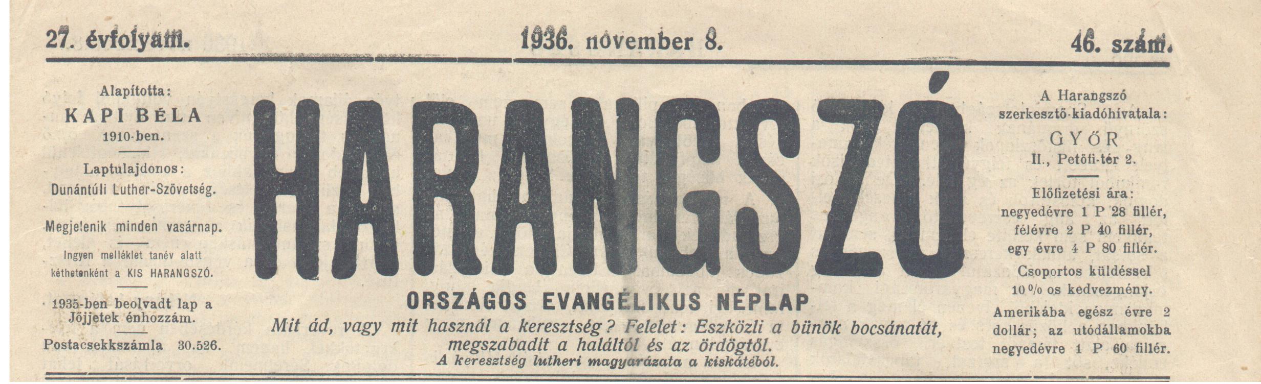 Harangszó, 1936. november 8., mely a szentelésről beszámolt